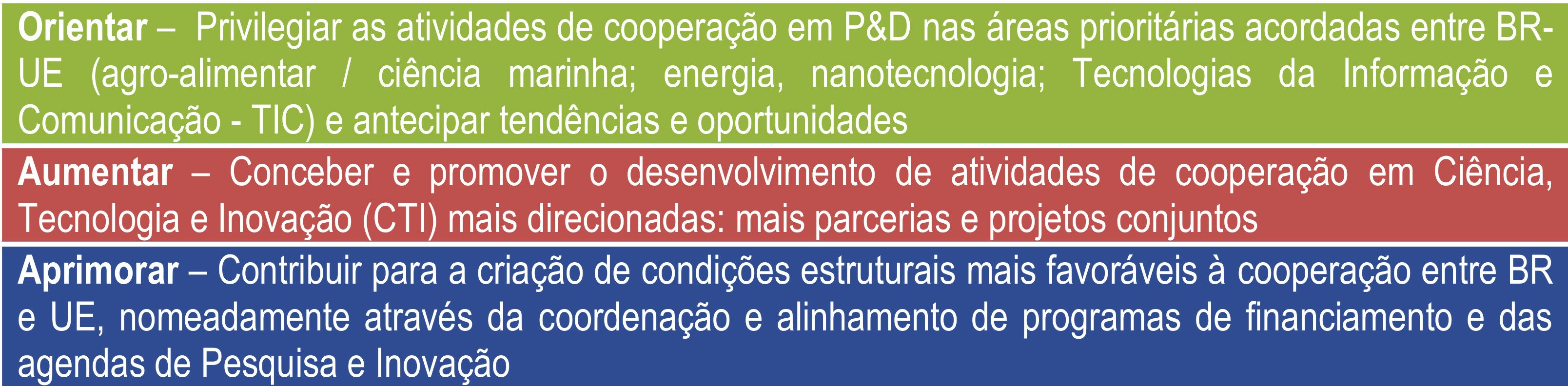 O objetivo do INCOBRA é orientar, aumentar e aprimorar as atividades de cooperação em atores de Pesquisa e Inovação (P&I) do Brasil (BR) e da União Europeia (UE), de modo a obterem benefícios mútuos. Este objetivo foi construído com base nas três dimensões ressaltadas a seguir: